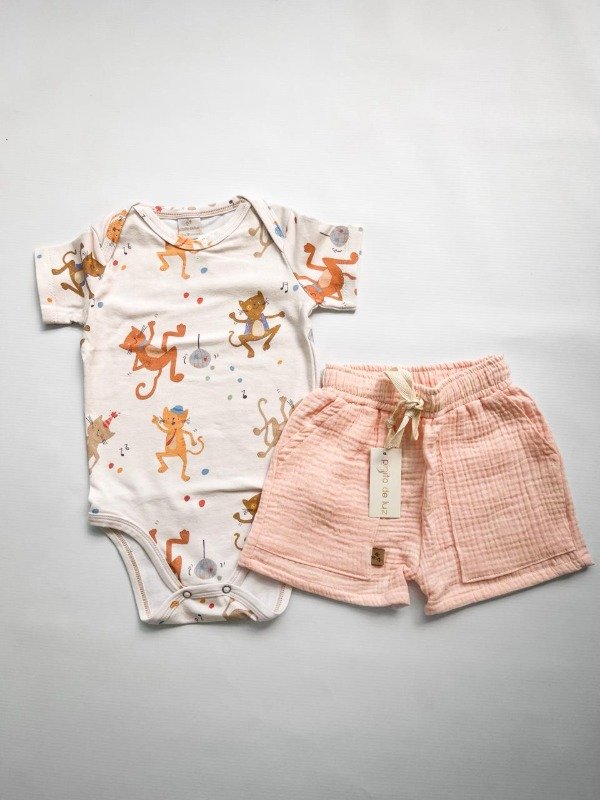 Este combo incluye un body gatitos en la disco y un short de gasa coral.