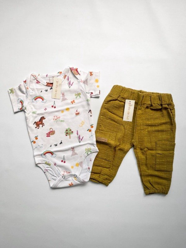 Este combo incluye un body estampado picnic y un pantalón de lino helecho.