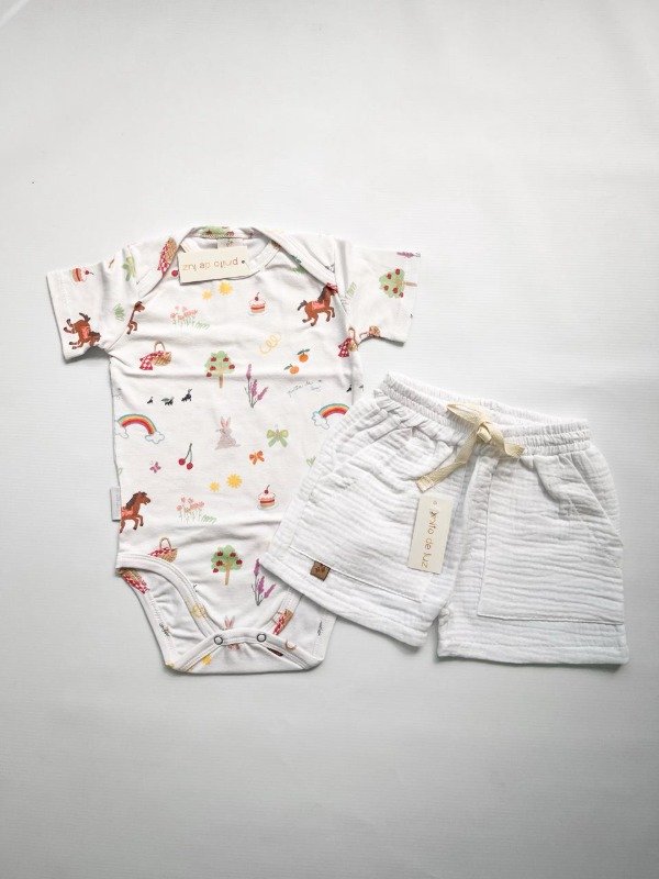 Este combo incluye un body estampado picnic y un short de gasa blanco.
