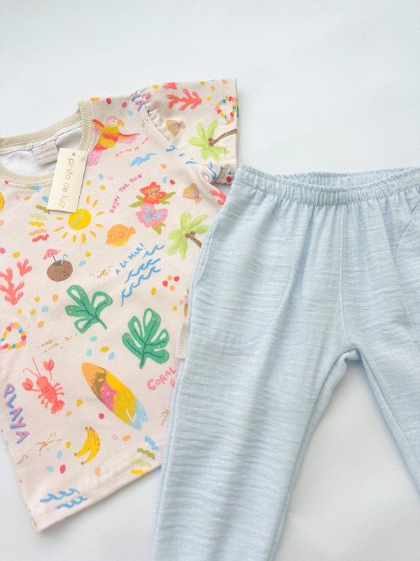 Remera playa y pant lino celeste